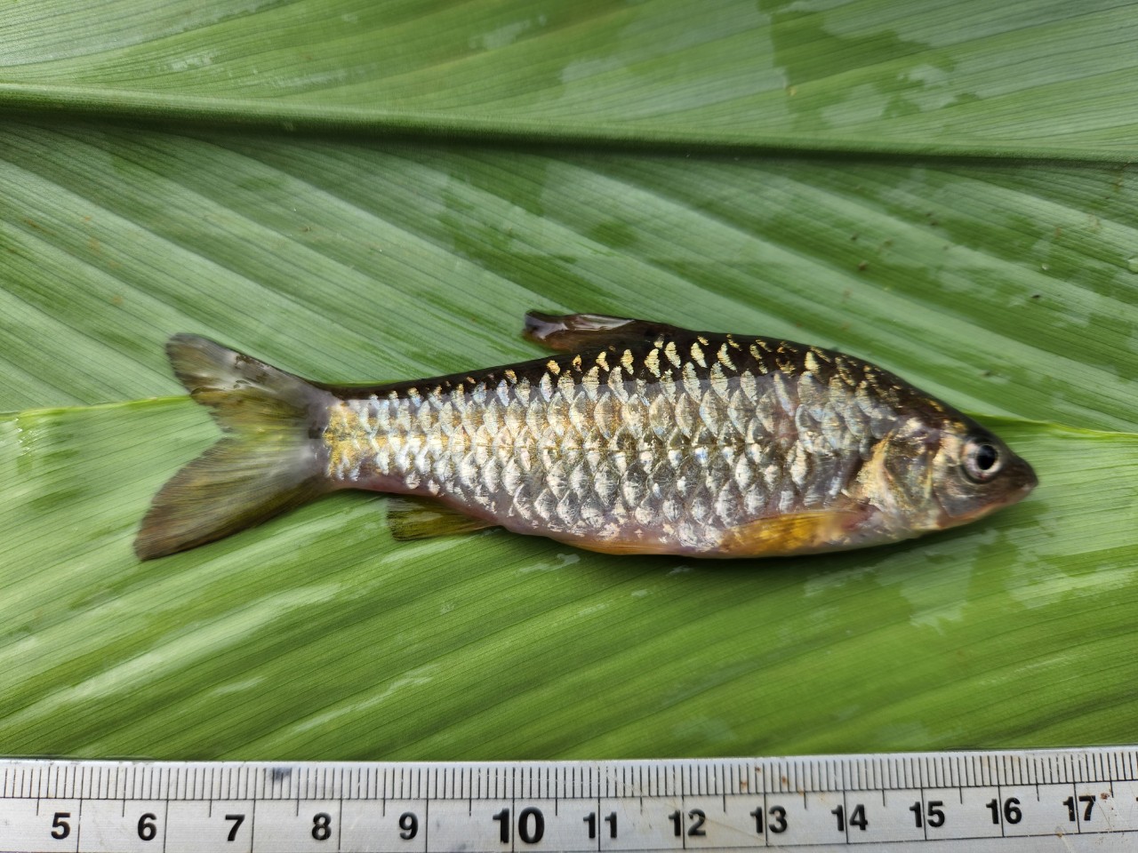 Hình Thái: Tia mềm vùng lưng (tổng số): 17-19; Tia mềm hậu môn : 8. Khác biệt với các loài khác trong chi là có 12-18 tia vây lưng phân nhánh; 6-9 hàng đốm dọc theo hàng vảy (không phải lúc nào cũng khác biệt) và một đốm tròn lớn trên cuống đuôi . Không có sọc đen ở giữa; đôi khi có một đốm phía trên vây ngực